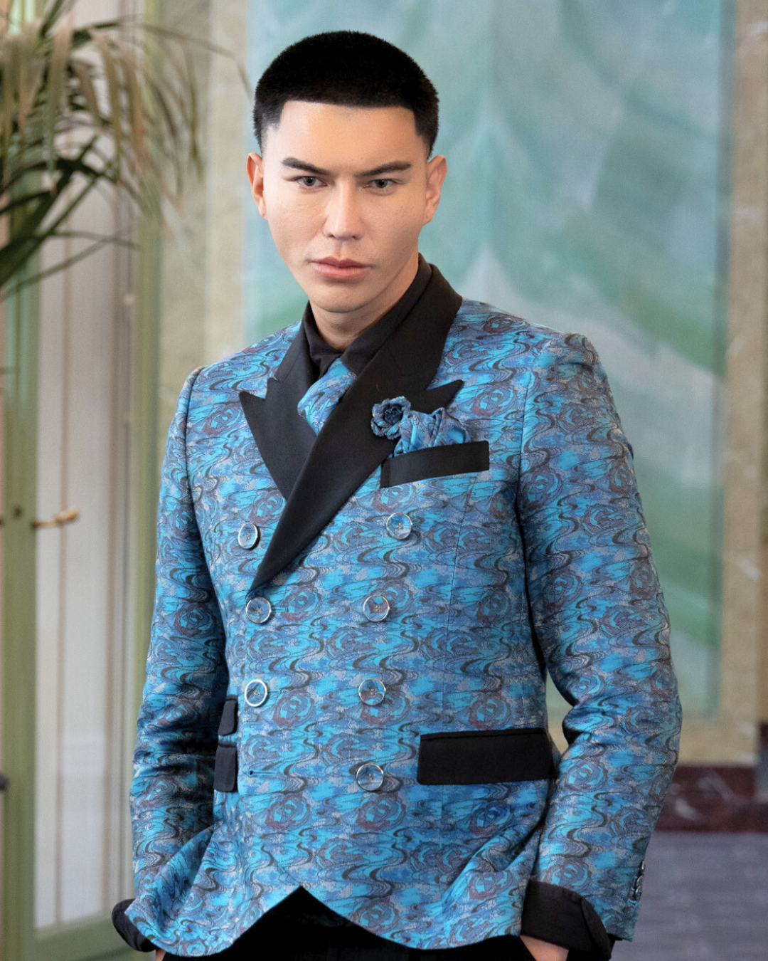 Outer: 85% wool, 15% silk Separate fabric/lapel: 100% silk (Nishijin weave/weft brocade) Back: 100% cupra |